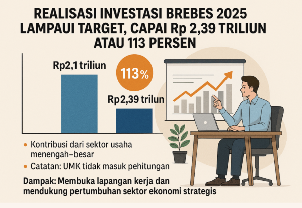 BREBES, Warta Brebes— Realisasi investasi di Kabupaten Brebes sepanjang tahun 2025 melampaui target yang ditetapkan pemerintah pusat. Berdasarkan rilis resmi Kementerian Investasi/BKPM, total investasi yang masuk mencapai Rp2.391.012.214.222 atau 113 persen dari target Rp2,1 triliun.