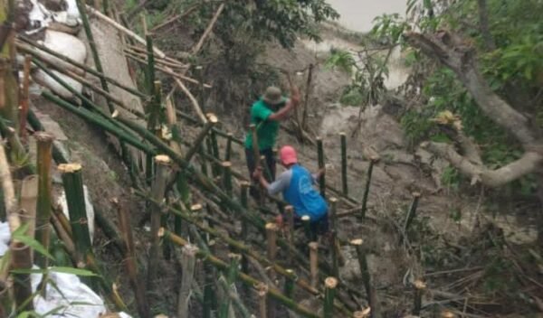 Pemerintah desa melakukan penanganan darurat menggunakan kayu dolken, bambu, dan karung.